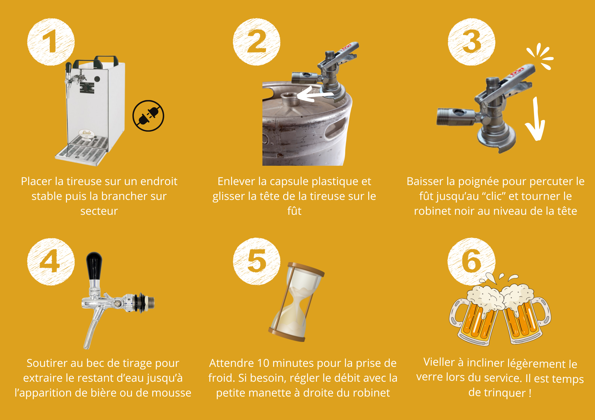 Si vous préférez venir chercher votre tireuse et vos fûts de bière directement à Neuville-sur-Saône, pas de souci ! L’installation est un jeu d’enfant grâce à notre schéma ci-dessous. Suivez simplement les étapes et vous serez prêts à servir des bières fraîches en un rien de temps. Si vous préférez nous laisser gérer, on s’occupe de tout : livraison, installation et démontage.